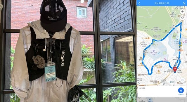 행사 참가자들에게 앞서 전달된 모자, 윈드브레이커, 러닝 베스트와 한남 몽클로스 런 러닝 코스 이미지. = 이인영 기자