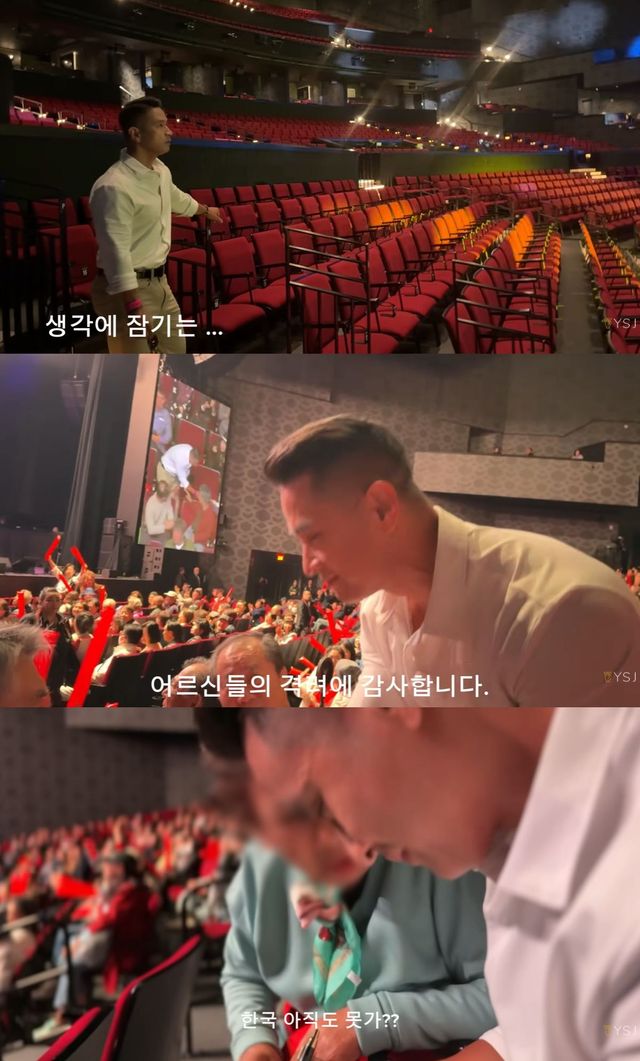 태진아의 소개에 유승준은 자리에서 일어나 90도로 허리를 숙여 인사 하며 감사를 표했다. 그는 객석을 채운 어르신들의 환대에 감동하며 눈시울이 붉어지기도.