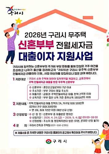 경기도 구리시가 결혼 7년 이내 무주택 부부를 위한 금융 지원책을 대폭 강화한다. 전월세 자금을 빌린 신혼가정의 이자 부담을 덜어주는 사업이 오는 4월 24일 문을 연다. 연합뉴스에 따르면 올해 달라진 핵심은 자녀를 둔 가구에 대한 지원 한도가 기존 100만원에서 200만원으로 두 배 확대된다는 점이다.