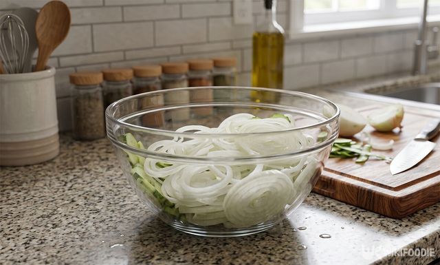 오이 1개와 양파 반 개를 채칼로 얇게 썬다.