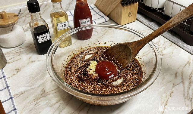 다른 볼에 간장 6큰술, 절임 물 4큰술, 참기름 4큰술, 식초 4큰술, 설탕 4큰술, 고춧가루 2큰술, 참깨 2큰술, 고추장 1큰술, 케첩 1큰술, 다진 마늘 반 큰술을 넣고 섞는다.