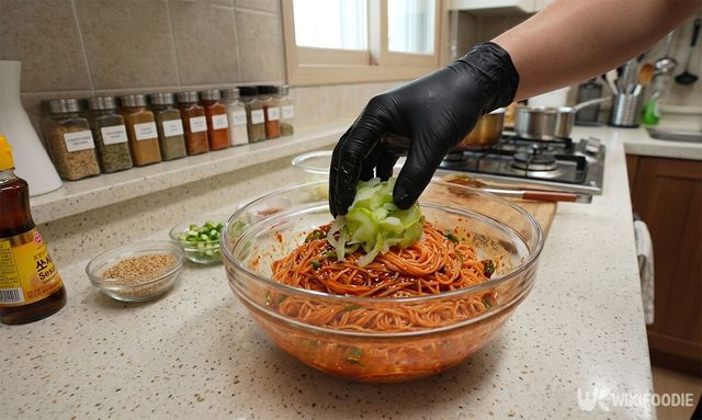 물기를 뺀 면에 준비한 양념장을 8~9큰술 정도 넣고 골고루 비빈다. 면 사이사이에 양념이 고루 퍼지도록 정성껏 버무린 뒤 그릇에 담는다.
