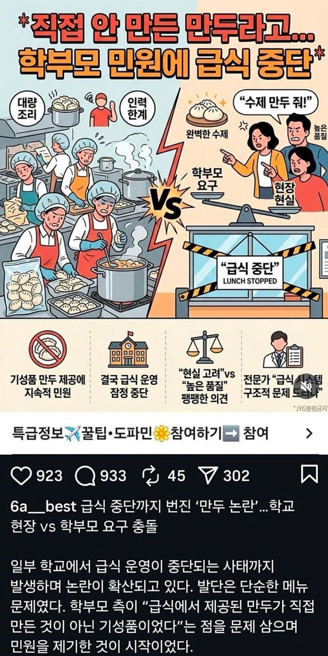 여러분은 이번 급식 중단 사태에 대해 어떻게 생각하시나요? "수제 만두를 요구하는 것은 부모로서 당연한 권리다"라는 입장과 "조리 환경을 고려하지 않은 과도한 요구나 갑질이다"라는 의견 중 어디에 더 공감하시나요? 우리 아이들을 위한 건강한 급식 문화를 만드는 해법은 무엇일지 댓글로 자유롭게 나눠주세요.