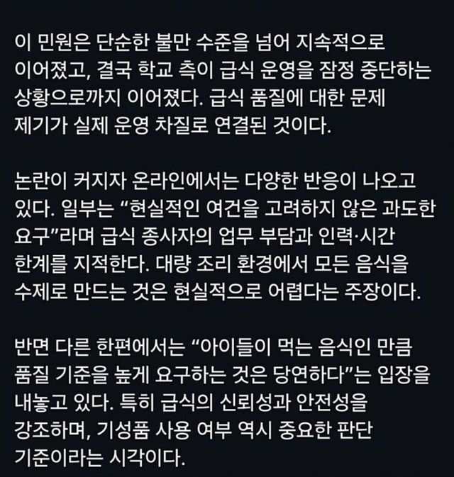 학부모의 '높은 품질 요구'와 급식소의 '인력 및 시설 한계'라는 두 가치가 정면으로 충돌하면서, 정작 그 피해는 매일 점심을 기다리던 아이들에게 고스란히 돌아가게 된 셈입니다. 이는 품질에 대한 정당한 권리 주장인지, 아니면 조리 현장을 무시한 과도한 갑질인지에 대한 뜨거운 논쟁으로 번지고 있습니다.