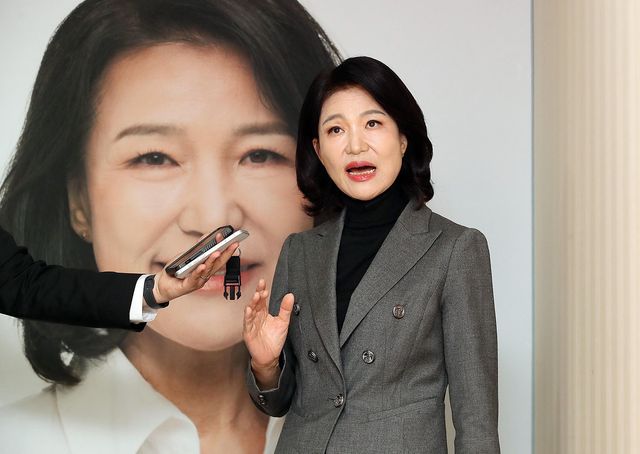 국민의힘 대구시장 경선에서 공천 배제(컷오프)된 이진숙 전 방송통신위원장이 14일 오후 대구 수성구 국민의힘 대구시당에서 기자회견을 하고 있다. / 연합뉴스