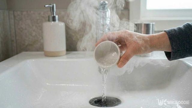 베이킹소다를 넣은 뒤에는 팔팔 끓인 뜨거운 물 500ml를 천천히 배수구에 부어준다. 이때 너무 빠르게 붓지 않고 일정한 속도로 흘려보내야 베이킹소다가 배수관 벽면에 접촉하는 시간이 길어진다. 이 상태로 최소 3~4시간 동안 배수구를 건드리지 않고 그대로 두어야 한다.