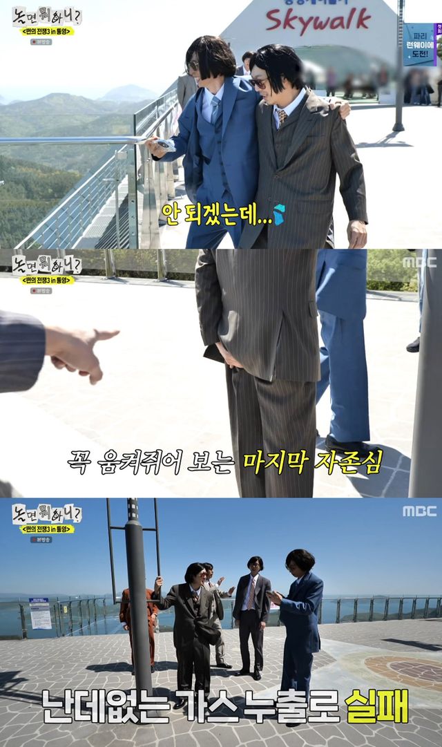 하지만 겁이 많은 하하와 유재석은 쉽게 움직이지 못했다. 이에 주우재는 "형님들은 케이블카 비용 내기에서 빼줄 테니까 난간 끝에 가서 셀카 찍으라"고 제안했다.