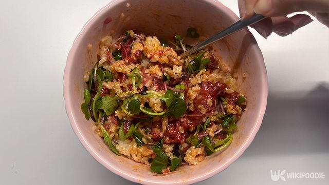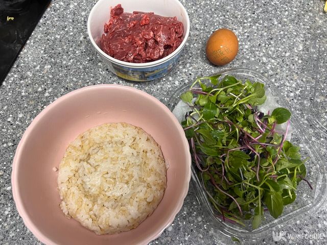 밥은 미리 준비해 한 김 식혀두는 과정이 필요하다. 갓 지은 밥 2공기를 그릇에 담아 약 3분 정도 두면 표면의 열기가 자연스럽게 빠진다. 이 과정을 거치면 밥알이 지나치게 뜨겁지 않은 상태가 된다. 온도가 높은 상태에서 육회를 바로 올리면 고기 표면이 익어 식감이 달라질 수 있다.