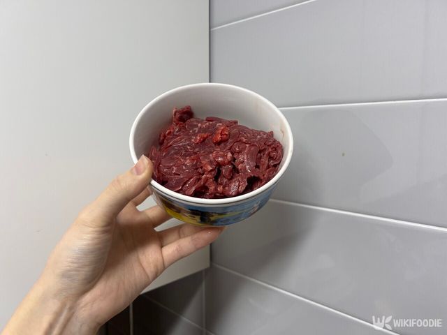 1. 육회용 소고기 200g을 결 반대 방향으로 가늘게 썬다.