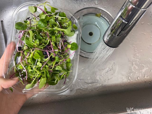 3. 어린잎 채소 한 줌을 찬물에 담가 흔들어 씻고 체에 밭쳐 물기를 뺀다.