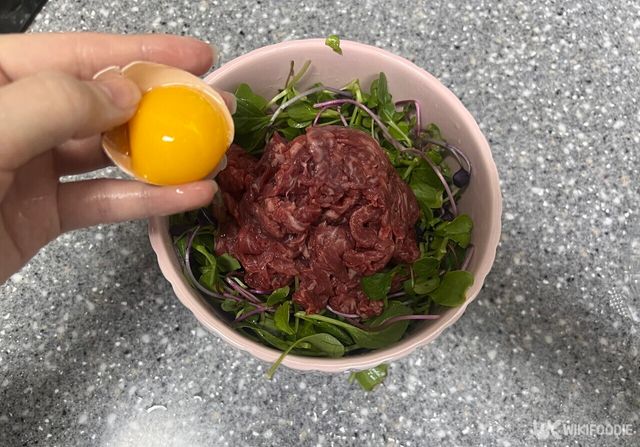- 밥 2공기, 육회용 소고기 200g, 어린잎 채소 한 줌, 달걀 1개, 고추장 2큰술, 다진 마늘 1큰술, 참기름 1큰술, 설탕 1작은술, 간장 1작은술, 통깨 1큰술