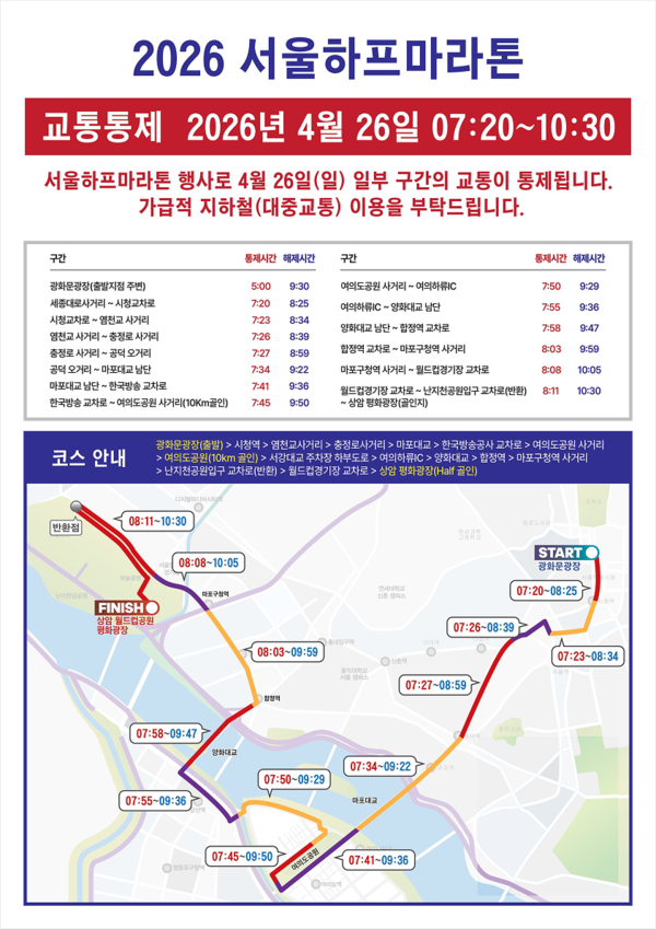 대회 당일에는 오전 7시 20분부터 10시 30분까지 주요 구간에서 순차적인 교통 통제가 시행된다. 통제 구간은 광화문광장과 세종대로, 마포대로, 마포대교, 여의대로, 국회대로, 양화대교, 합정역, 마포구청역, 월드컵로 일대 등이며, 구간별로 약 1시간에서 최대 2시간 30분가량 통제가 이뤄질 예정이다.