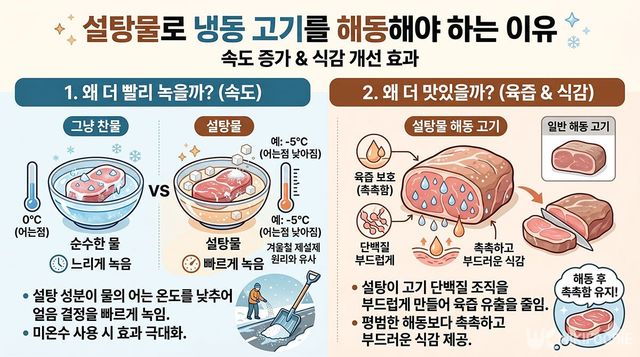 설탕이 물에 녹으면 순수한 물만 있을 때보다 얼음이 녹는 속도가 훨씬 빨라진다. 이는 설탕 성분이 물이 얼기 시작하는 온도를 낮추기 때문이다. 겨울철 눈이 쌓인 도로에 제설제를 뿌려 얼음을 녹이는 것과 비슷한 방식으로 이해하면 쉽다. 그냥 찬물에 담가두는 것보다 설탕이 섞인 미온수를 사용하면 고기 겉면에 붙은 얼음 결정이 더 빠르게 사라지게 된다.