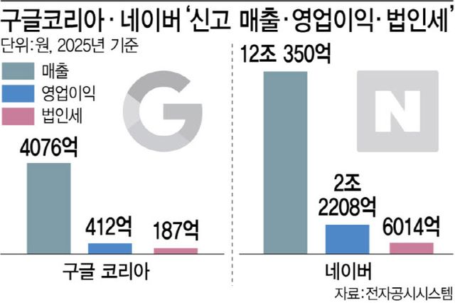 이 같은 구조는 법인세 납부액에서 더 뚜렷하게 드러난다. 네이버가 지난해 6014억원의 법인세를 납부한 반면, 구글코리아의 법인세 비용은 187억원에 그쳤다. 매출 규모가 비슷하다는 추정과 비교하면 세 부담 격차가 크게 벌어지는 셈이다.