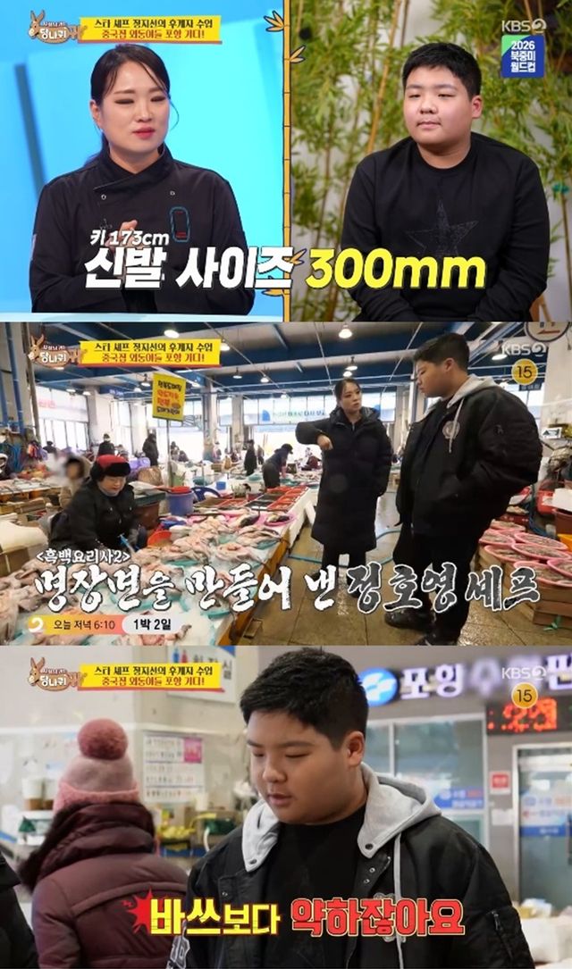 이날 정지선은 올해 6학년이 된 우형이와 함께 포항을 찾았다. 우형이는 키 173cm에 신발사이즈가 300mm로 폭풍성장한 상태였다.