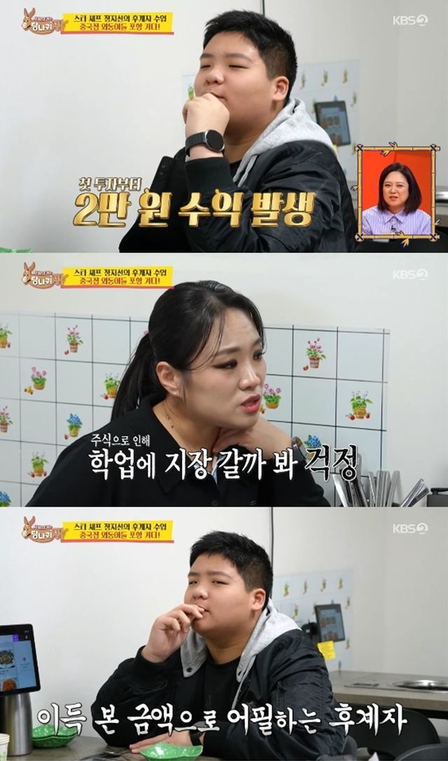 정지선은 우형이가 주식 때문에 공부를 소홀히 할까봐 "학교 공부를 잘해야 주식을 잘할 수 있는 거다"라고 얘기했다.