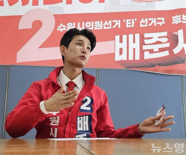 1982년생으로 수원공고를 졸업한 배 후보는 군 복무를 마친 뒤 월급 45만 원의 도면 사무실 막내로 사회에 첫발을 디뎠다. 연필을 깎고, 청사진을 암모니아 현상기에 밀어 넣으며 7~8년간 현장 경험을 쌓은 뒤 개인사업자로 창업했고, 현재는 직원 7~8명 규모의 법인을 이끌고 있다. 군 복무 2년 반을 제외하면 평생 수원을 떠난 적이 없다는 그는 "이 지역에서 나고 자라고 일하고 세금을 낸 사람이 시의원이 돼야 한다"고 강조했다.