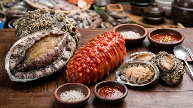 왼쪽부터 차례대로 전복, 홍해삼, 오분자기가 놓여있는 모습. 기사 이해를 돕기 위해 AI가 생성한 자료사진. (실제와 차이가 있을 수 있음을 알립니다.)