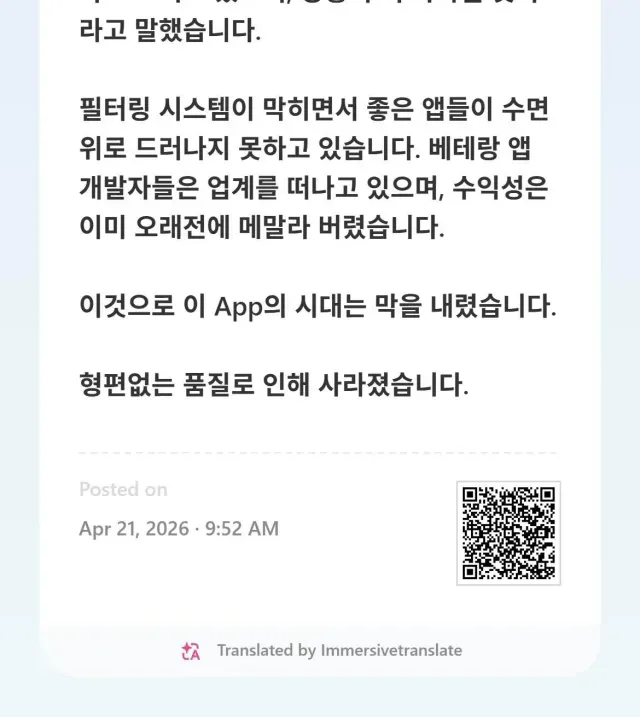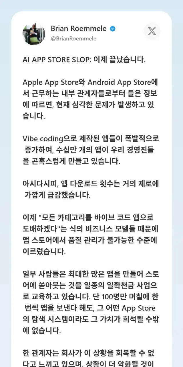 현재 ai로 막 찍어낸 저질 앱들을 거를수가 없게되면서 점점 앱스토어 시장이 망해가고 있다고함