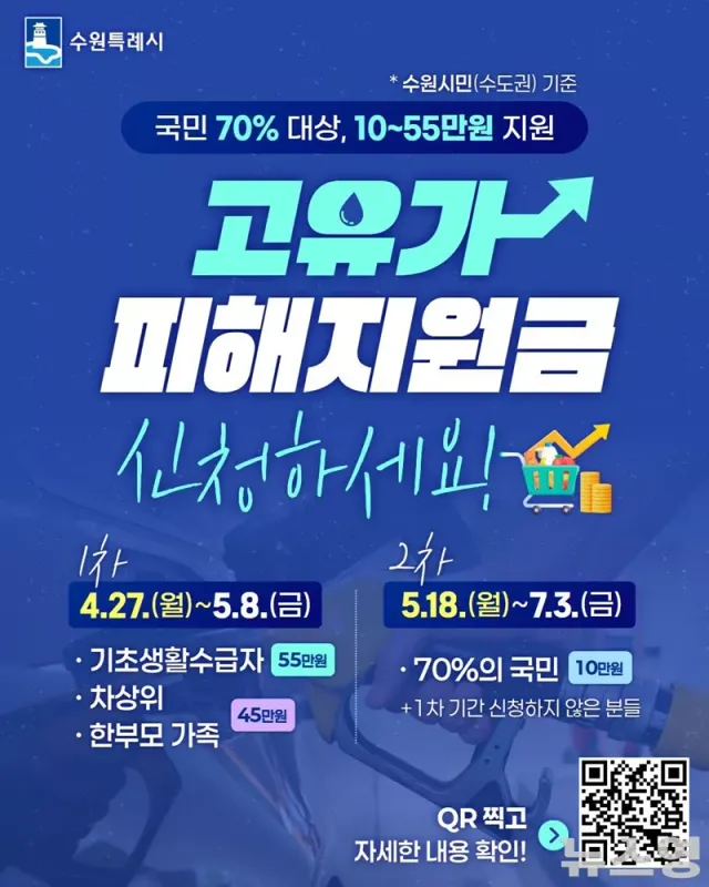 고유가 피해지원금은 중동전쟁 발 고유가·고환율·고물가로 인한 국민 부담 경감을 위해 정부가 지급하는 것으로, 지원 금액은 소득별·지역별로 차등 적용된다. 수도권 기준 기초수급자 55만 원, 차상위계층·한부모가정 45만 원, 소득 하위 70% 시민 10만 원이다.