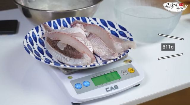 인터넷에서 구매한 참돔의 수율을 재보니, 611g으로 측정됐다. / 유튜브 '입질의추억TV jiminTV'