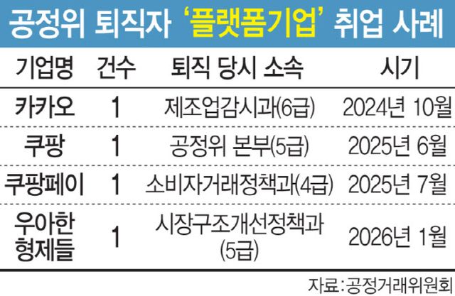 공정위 퇴직 공무원들의 플랫폼행은 2024년 카카오를 시작으로, 2025년 쿠팡·쿠팡페이로 확대됐고 올해 1분기에는 우아한형제 등으로 확산하는 추세다. 특히 쿠팡은 최근 동일인(총수) 지정 논란과 각종 공정위 사건이 겹치면서 관련 대응 인력 수요가 크게 늘어난 것으로 분석된다.