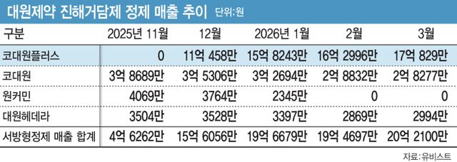 실제로 코대원플러스정 출시 이전까지 대원제약은 오스틴제약, 유한양행(000100)에 밀려 정제 시장 3위에 머물렀지만 출시 이후 단숨에 1위로 올라섰다. 기존 제품인 코대원정 매출은 일부 감소했지만,코대원플러스정의 성장 폭이 이를 상회하면서 전체 정제 매출도 오히려 확대됐다. 대원제약의 진해거담제 정제 매출은 지난해 11월 4억6000만원에서 올해 3월 20억2000만원으로 4배 이상 증가했다.