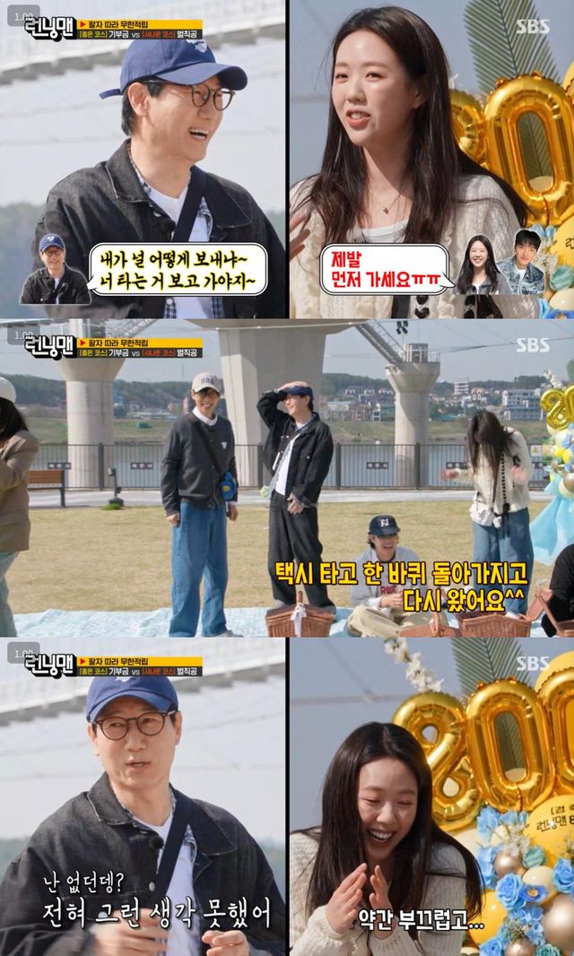 모두가 빵 터진 가운데, 지예은은 "(지석진) 선배님이 안 가더라. 그래서 먼저 가라고 했는데 타는 거 보고 가겠다고 하더라. 그래서 불렀다"고 이야기했다.