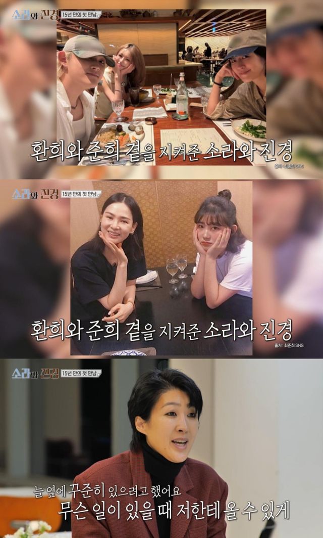 이소라는 "진경이가 대단하다고 생각했다. 애들, 환희와 준희를 네가 계속 챙기더라. 이게 정말 내 아이들이나 가족 조카 챙기기도 힘든 일 아니냐"라고 이야기했다.
