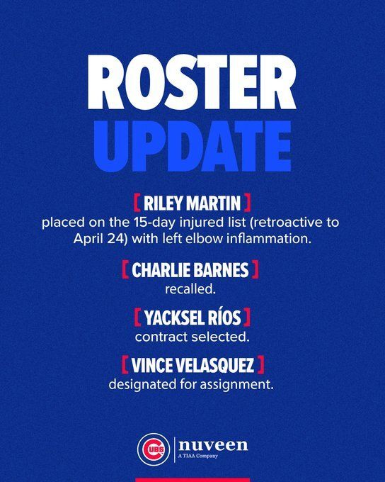 미국 MLB 전문 매체 'MLB 트레이드 루머스'는 27일(한국시간) "컵스가 우완 약셀 리오스와 좌완 찰리 반즈를 콜업하는 대신 우완 빈스 벨라스케즈를 지명할당했다"고 전했다. 이어 "좌완 라일리 마틴은 팔꿈치 염증으로 15일 부상자 명단에 올랐다"고 덧붙였다. 컵스 구단 역시 같은날 이 선택을 공식 발표했다.
