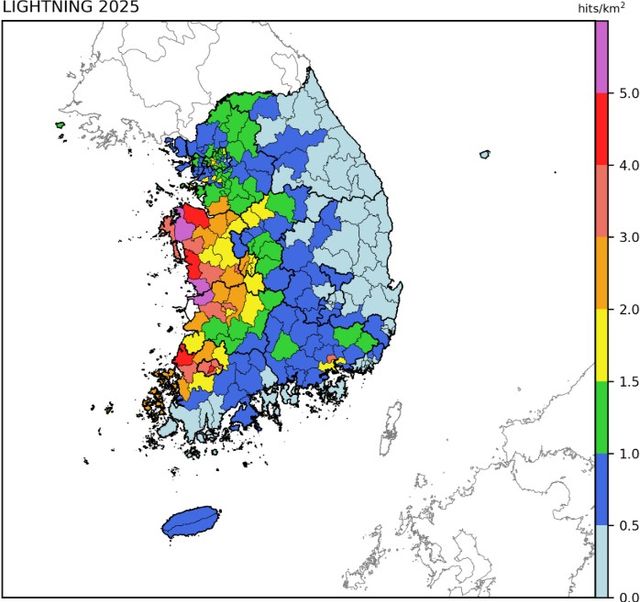 | ▲ 2025년 시·군·구별 단위면적 당 낙뢰 발생 횟수 공간분포 |