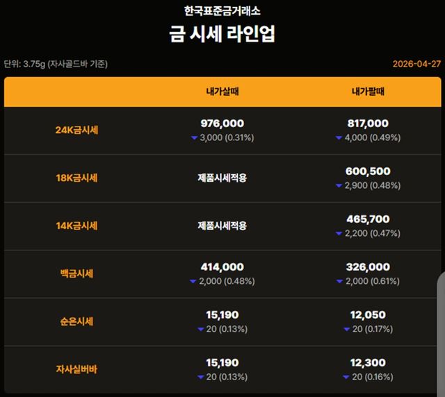국내 금시세(금값)가 27일(이하 한국 시각) 오후 하락세(전 거래일 대비)를 보이고 있다.
