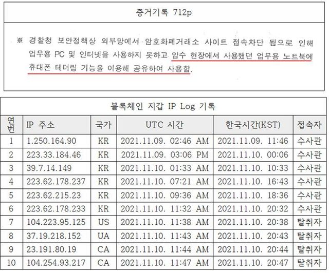 블록체인닷컴이 제출한 IP 로그는 더욱 노골적이다. 11월9일부터 10일 오후 8시32분까지 모두 한국 IP를 사용한 수사관 접속 기록이다. 이후 마지막 김 경사의 접속 6분 뒤, 미국·우크라이나·캐나다 IP를 통한 접속이 연속으로 발생한다.