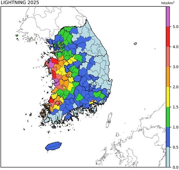 ▲ 지난해 시·군·구별 단위 면적당 낙뢰 발생 횟수 공간분포도. 기상청 제공