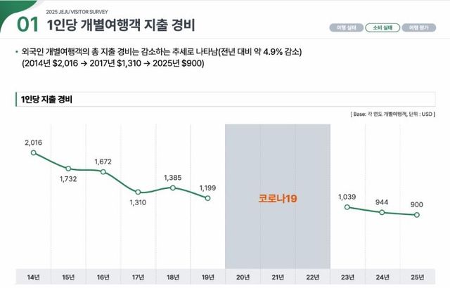 27일 제주도와 제주관광공사의 '제주도 방문관광객 실태조사 보고서'(12개년도 통합 분석)에 따르면 2025년 외국인 개별여행객의 총 지출 경비는 1인당 900달러로, 2014년(2016달러)의 절반 이하로 떨어졌다. 코로나19 직전인 2019년 1199달러에서, 중단됐던 관광이 재개된 2023년 1039달러로 줄었고 2024년 944달러에 이어 작년까지 줄곧 감소했다.