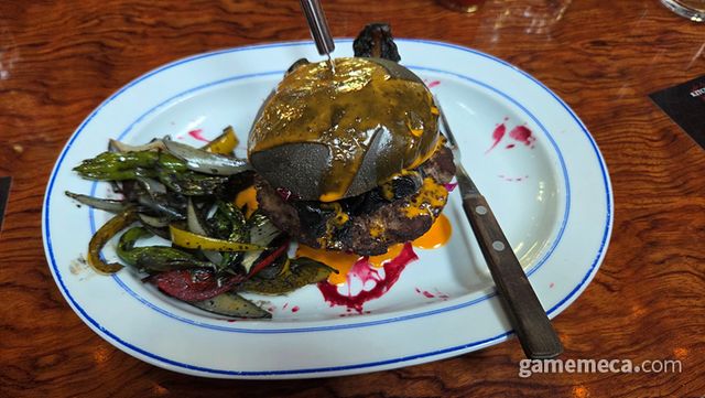 ▲가장 먼저 나온 '지옥의 성찬'. 도살자에게 영감을 받은 음식 답게, 소고기 패티와 피를 연상케 하는 크랜베리 소스가 돋보인다 (사진: 게임메카 촬영)