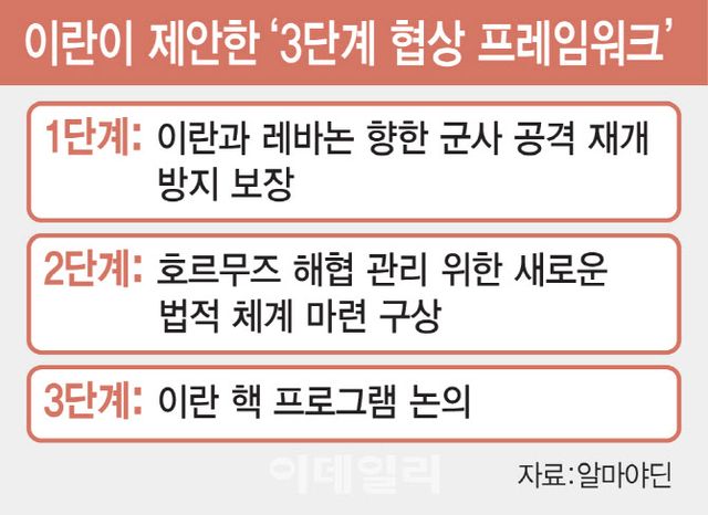 이란의 활발한 외교전은 이란 종전 구상에 대한 지지 확보를 위한 것으로 보인다. 미 악시오스는 미 당국자를 인용해 이란이 파키스탄 중재자를 통해 호르무즈를 개방하고 종전을 선언한 뒤 추후 핵 협상을 이어가자고 미국에 제안했다고 보도했다. 이란의 호르무즈 해협 통제와 미국의 대이란 해상 봉쇄 문제를 가장 먼저 해결하겠다는 것이다. 친이란 레바논 무장정파 헤즈볼라 측과 연계된 레바논 매체 알마야딘 또한 이란이 중재자를 통해 ‘3단계 협상 프레임워크’를 미국에 제안했다고 보도했다. 1단계는 추가 군사 침략 방지 보장, 2단계는 호르무즈 해협 관리, 3단계는 이란 핵 프로그램으로, 이란은 앞선 1, 2단계에 대한 합의가 이뤄지지 않는다면 핵 문제 협상에는 참여하지 않겠다는 태도다.