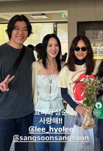 공개된 사진 속 엄정화는 이효리, 이상순과 나란히 서서 환한 미소를 짓고 있다. 이효리는 선글라스를 착용한 채 편안한 분위기를 자아냈다.