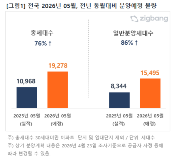 27일 부동산 플랫폼 직방 조사에 따르면 오는 5월 전국 아파트 분양예정 물량은 총 1만 9,278가구로 집계된 것으로 전해졌다. 전년 동월 실적(2025년 5월 1만 968가구) 대비 약 76% 늘었고, 일반분양 역시 8,344가구에서 1만 5,495가구로 약 86% 늘었다.