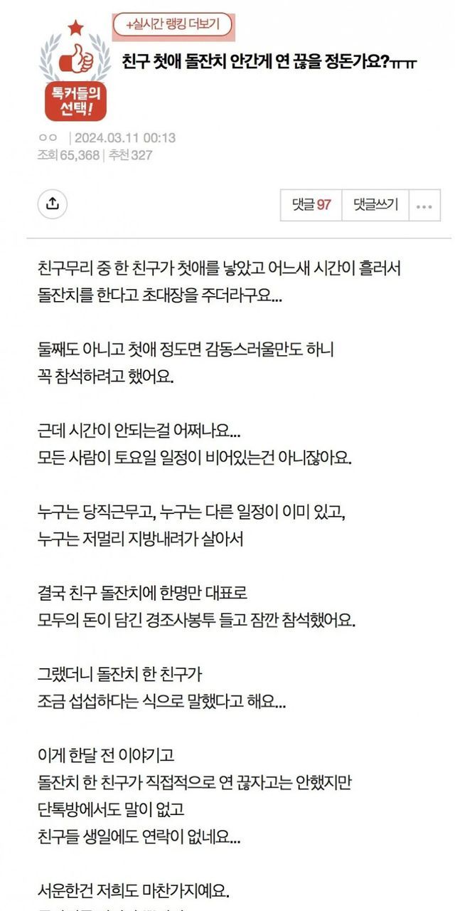 여러분은 친구의 첫애 돌잔치에 불참하고 축의금만 보냈을 때, 친구가 서운해하며 연락을 끊는다면 어떻게 대응하시겠습니까? "그래도 첫째인데 가줬어야 한다"는 의견과 "축의금 보냈으면 충분하다"는 의견 중 어느 쪽에 더 마음이 기우시나요? 여러분의 경험이나 생각을 댓글로 남겨주세요.
