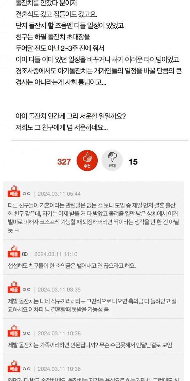또한 대다수는 돌잔치가 가족 중심의 행사로 변화하는 사회적 동념을 언급하며, 친구들에게 참석을 강요하는 것 자체가 민폐라고 지적했습니다. "축의금을 냈으면 할 도리를 다한 것"이라는 의견과 함께, 친구의 일방적인 서운함 때문에 스트레스받지 말고 차라리 이번 기회에 관계를 정리하라는 조언이 쏟아졌습니다.