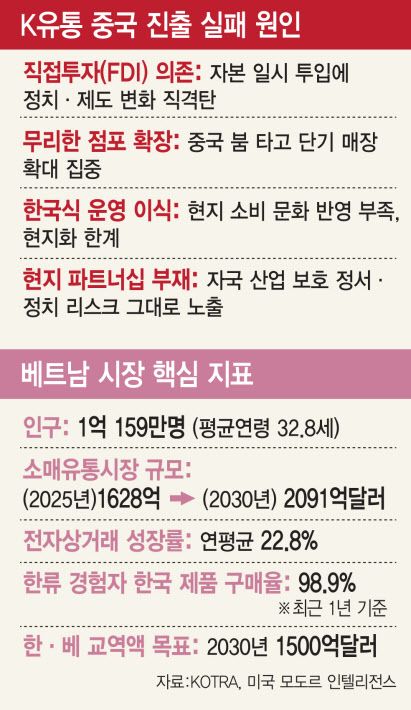 과거 전철을 피하려면 ‘베트남이 함부로 내치지 못하는 구조’를 만들어야 한다는 것이 전문가들의 진단이다. 직접투자 대신 합작법인이나 마스터 프랜차이즈(현지 사업자에 운영권을 위임하는 방식)로 진출하고, 핵심 도시를 거점으로 삼는 전략이 거론된다. 동남아 전체를 묶는 통합적 접근도 필요하다는 조언도 나온다. 최근 이마트(139480)가 베트남 1위 자동차그룹 타코, 남양유업(003920)이 푸 타이 홀딩스, CJ제일제당이 베트남 최대 유통사 ‘박화산’과 손잡은 것도 이런 맥락이다.