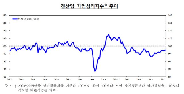 CBSI는 기업경기실사지수(BSI) 가운데 주요 지수(제조업 5개·비제조업 4개)를 바탕으로 산출한 심리 지표다. 과거(2003~2025년) 평균을 100으로 이를 웃돌면 경제 전반에 대한 기업 심리가 낙관적, 반대로 밑돌면 비관적이라는 뜻이다.