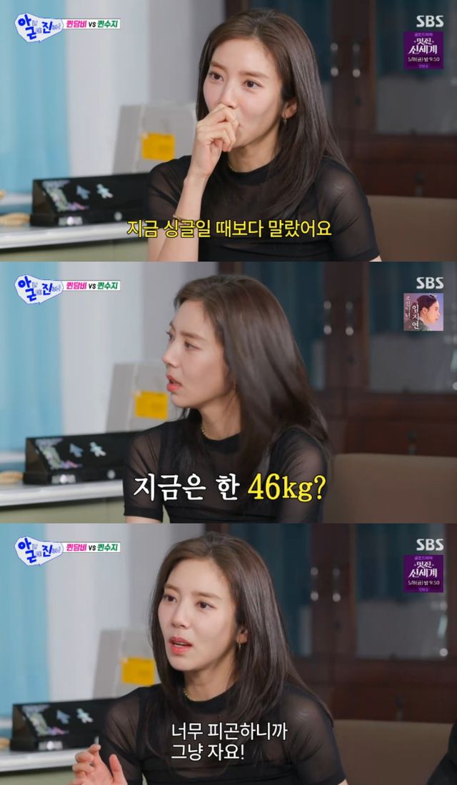 이어 "제가 한창 활동할 때 '건강미'가 매력이었지 않냐. 제 키가 168cm인데, 그 때가 50kg정도 나갔었다. 그런데 지금은 46kg"이라고 말해 모두를 놀라게 했다.