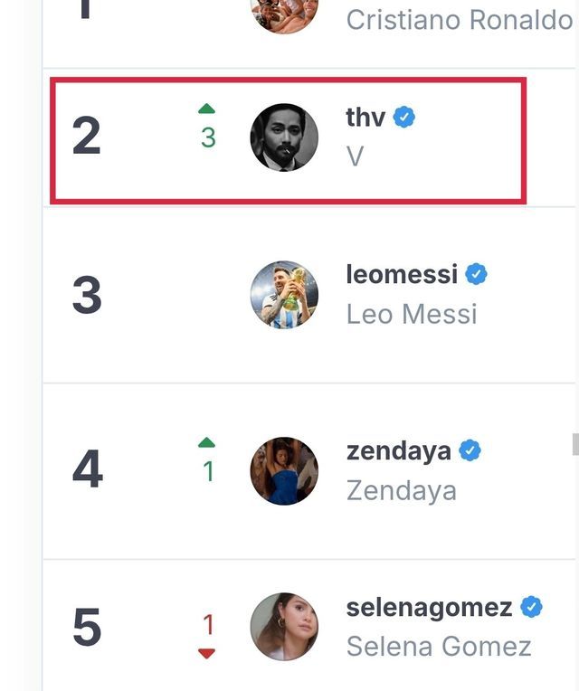 뷔의 인스타그램 영향력은 꾸준히 상승세다. 개인 계정 개설 당시 43분 만에 100만 팔로워를 돌파하며 기네스 기록을 세웠고, 현재는 한국 남자 연예인 최초로 7000만 팔로워를 넘었다. 평균 ‘좋아요’ 수는 1250만 개로 전 세계 1위를 기록하고 있으며, 참여율 역시 11.9%로 최상위 수준이다.