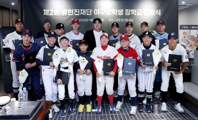 류현진재단은 지난 27일 대전 서구 ‘담라’에서 ‘2026 제2회 야구 장학생 장학금 전달식’을 열고 초·중·고교 선수 16명을 선발했다. 총 지원 규모는 6400만 원에 이르렀다.
