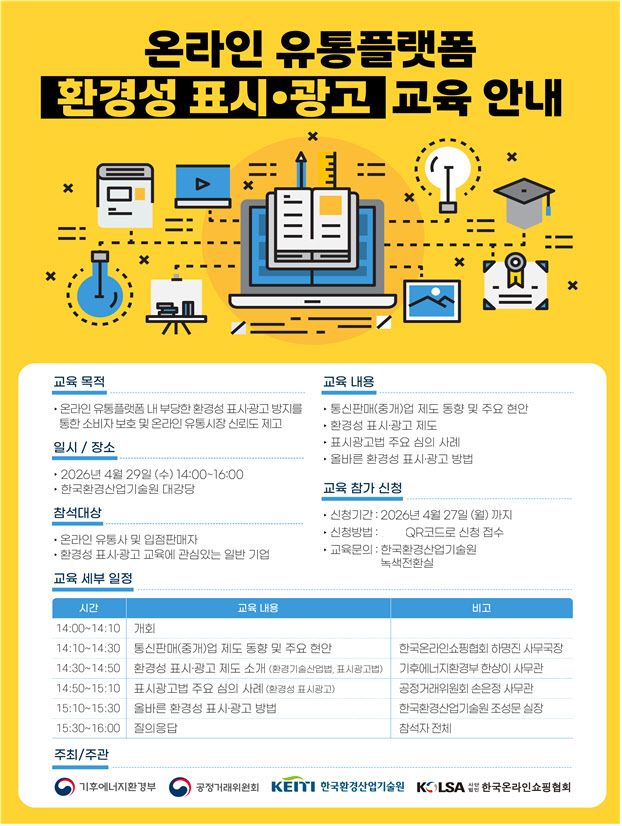 교육은 △통신판매중개업 제도 동향 및 주요 현안 △환경성 표시·광고 제도 소개 △표시광고법 주요 심의 사례 △올바른 환경성 표시·광고 방법 등 실무 중심 내용으로 구성된다. 전국 각지 입점판매업자도 참여할 수 있도록 실시간 온라인 중계도 병행한다.
