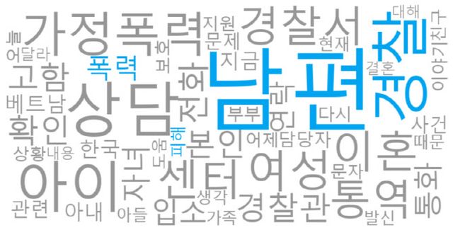 상담내용 분석 결과 ‘남편’, ‘경찰’, ‘상담’, ‘아이’, ‘피해’, ‘통역’, ‘입소’, ‘센터’ 등이 주요 키워드로 확인됐다. 전반적으로 남편의 가정폭력 피해를 신고한 사례가 많았으며 자녀가 있는 경우도 적지 않은 것으로 나타났다. 이후 경찰 신고를 거쳐 보호시설이나 센터에 입소하는 등 지원으로 이어지는 흐름이 확인된다.