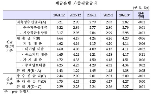 신규취급액 기준 예대금리차는 1.38%포인트로 전월보다 0.05%포인트 축소됐지만, 잔액 기준으로는 2.27%포인트로 0.01%포인트 확대됐다.