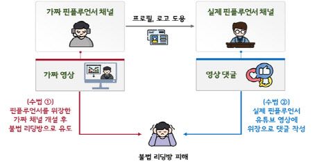 가장 대표적인 유형은 유명 핀플루언서를 사칭하는 수법이다. 실제 유튜브 채널의 프로필과 로고를 도용해 가짜 채널을 만든 뒤 가짜 영상, 댓글 등을 통해 불법 주식 리딩방으로 유도하는 방식이다. 모집 이후에는 댓글을 삭제해 증거를 인멸하는 것으로 추정된다.